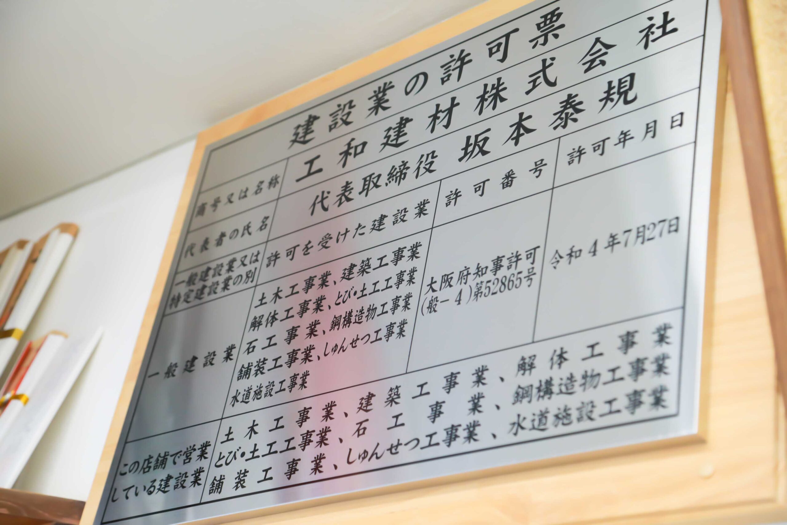 company 工和建材について 工和建材は、岸和田市を拠点に、高品質な建材の販売と、外構・土木・解体工事を手掛ける専門企業です。私たちは単に資材を供給するだけでなく、お客様の理想を形にするための確かな知識と技術を提供しています。地域に根ざした活動を通じて、快適で安全なまちづくりに貢献しています。 「一生懸命」が未来を創る。 HARD WORK CREATES THE FUFURE. Our Discovery 人々の想いと、確かな技術が出会う場所。それが、まちの未来を創る。 私たちは建材の販売や工事を通じて、人々の暮らしを支える「素材」そのものに触れてきました。そして、気づいたのです。本当に大切なのは、その素材に「一生懸命」な想いを込めること。その想いと確かな技術が出会うことで、ただの建物ではない、未来を創る力になると信じています。 Our Mission 「一生懸命」を、未来へ届ける。 私たちの使命は、一つひとつの建材に、そしてすべての工事に、お客様と私たちの「一生懸命」な想いを込めることです。地域社会に貢献し、次世代に誇れるような安全で快適なまちづくりに貢献するため、これからも誠実な仕事と最高のサービスを追求し続けます。 「一生懸命」が、未来を創る。 建材一つひとつに、そしてすべての工事に、お客様と私たちの「一生懸命」を込めること。これが、私の最も大切にする想いです。この想いを胸に、私たちは常に最高の品質を追求し、安心と信頼をお届けします。 代表取締役社長 坂本 泰規 会社概要 会社名 工和建材 株式会社 代表者 代表取締役社長 坂本 泰規 所在地 〒596-0801 大阪府岸和田市箕土路町2丁目17−11 設立 昭和48年4月 資本金 1,000万円 事業内容 土木工事業、建築工事業、解体工事業、とび・土木工事業、石工事業、鋼構造物工事業、塗装工事業、しゅんせつ工事業、水道施設工事業 取引銀行 大阪信用金庫・りそな銀行・東京三菱UFJ銀行・紀陽銀行 許可・登録 大阪府知事許可(般-4)第52865号 大阪府産業廃棄物収集運搬許可 許可番号02700134623 一級土木施工管理技士1人 級土木施工管理技士2人 二級建築施工管理1人 二級建築機械施工技士1人 連絡先 TEL:072-445-5797FAX:072-445-7650